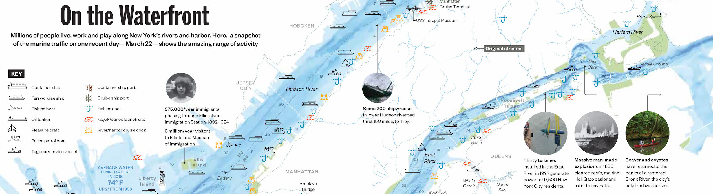 After poring over multiple sources and detailed maps to learn about the history, geography, and range of activities taking place along Manhattan's and Brooklyn's waterways and coastlines, we produced this engaging snapshot of a single day in the life of the waterways.